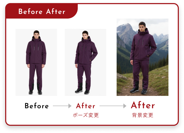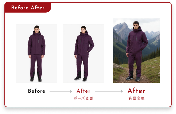 1枚の画像から、ポーズや背景を自由に変更可能です。
